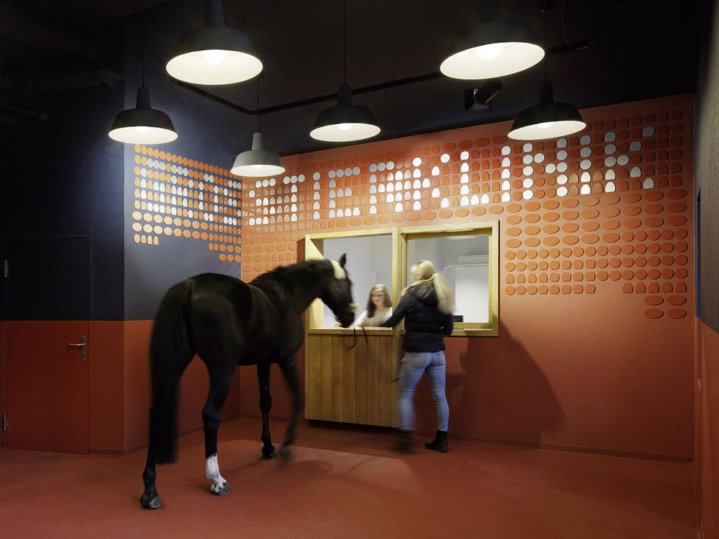 Im Hörsaal und Eingangsbreich der Grosstierklink der Uni Zürich hat Bureau Hindermann zusammen mit 3dimensional mit innenarchitektonischen Mitteln eine angenehme und lebensfrohe Lernatmosphäre geschaffen, die sich stark von der ursprünglich an diesem Ort vorgefundenen sterilen, weiss gekachelten Einrichtung unterscheidet. Farbig und mit feinen Bezügen zur Tierwelt präsentieren sich die Räume heute – als Beispiele seien der zum Multimediapult umfunktionierte Futterwagen und die Stalltüren bei der Reception genannt.